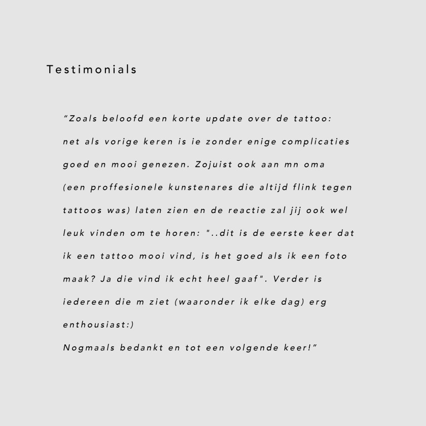 Door aandacht te geven aan de plaatsing en aan de natuurlijke lijnen van het lichaam, ontstaat een tattoo die subtiel en dynamisch is. Daarnaast deel ik regelmatig nieuwe handpoke-ontwerpen die ik graag zet; deze vind je in mijn Instagram Story Highlights.